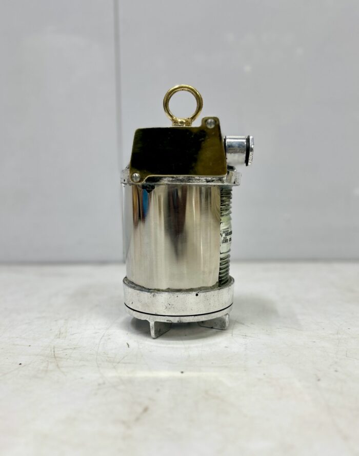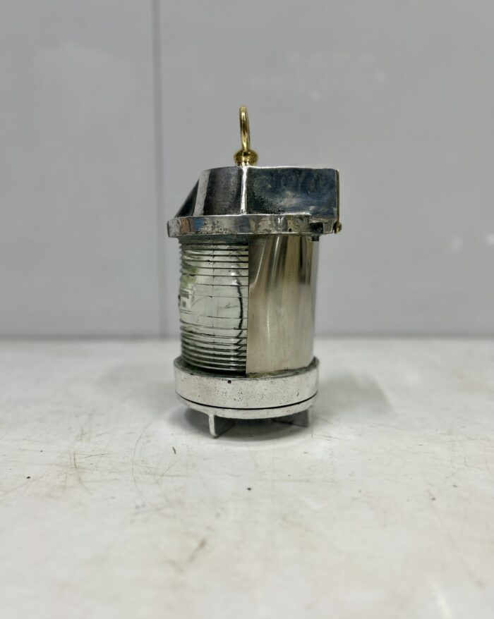 This vintage original Tranberg Serie masthead top antique ship bulkhead electric lamp features a small silver body complemented by a glass lens, exuding timeless elegance and maritime charm. Perfect for collectors and enthusiasts, this exquisite piece not only serves as a functional light source but also as a stunning decorative accent, ideal for enhancing any nautical-themed space. Its durable construction ensures longevity, making it a valuable addition to your home or office decor.