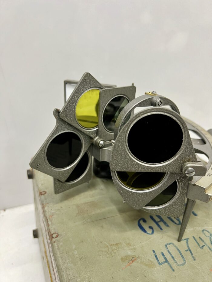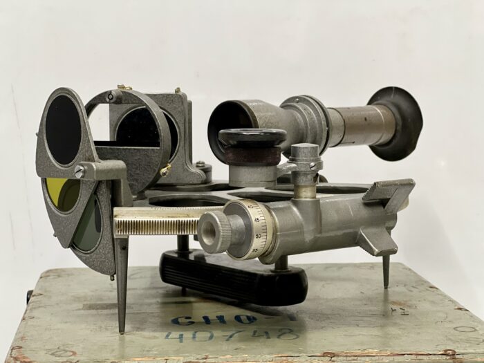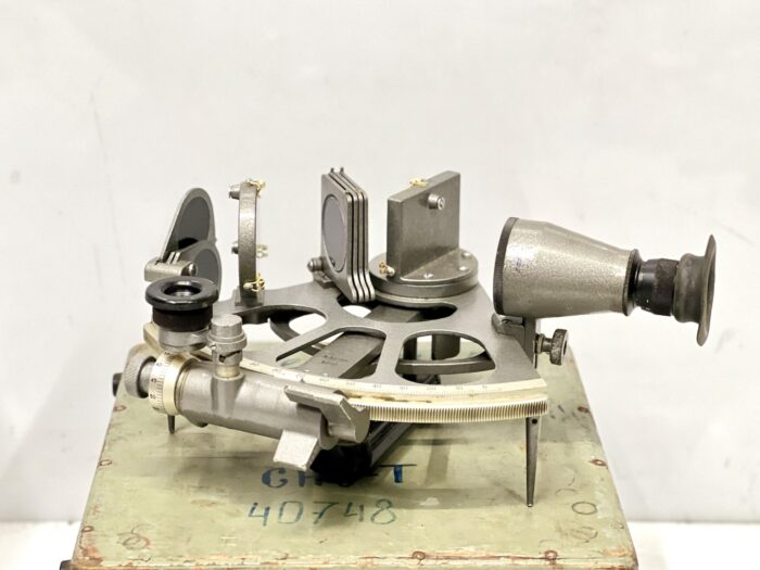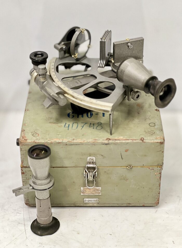 It is an Antique Astronomical Instrument Original Russian Navy Ship Reclaimed Vintage Sextant Instrument Made in USSR with Box for Sale from an old supertanker ship. A sextant is a doubly reflecting navigation instrument that measures the angular distance between two visible objects. The primary use of a sextant is to measure the angle between an astronomical object and the horizon for the purposes of celestial navigation.