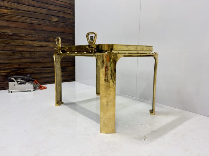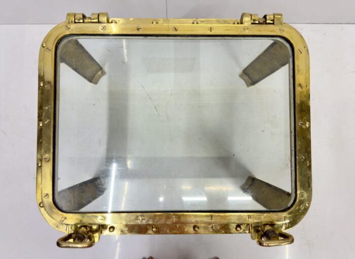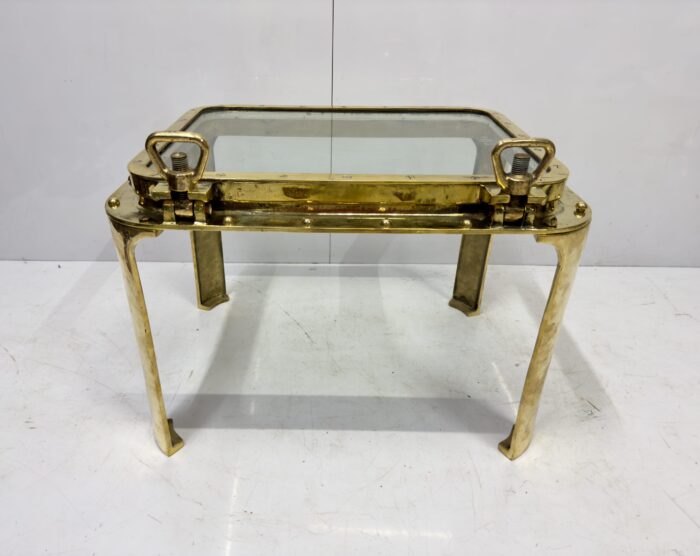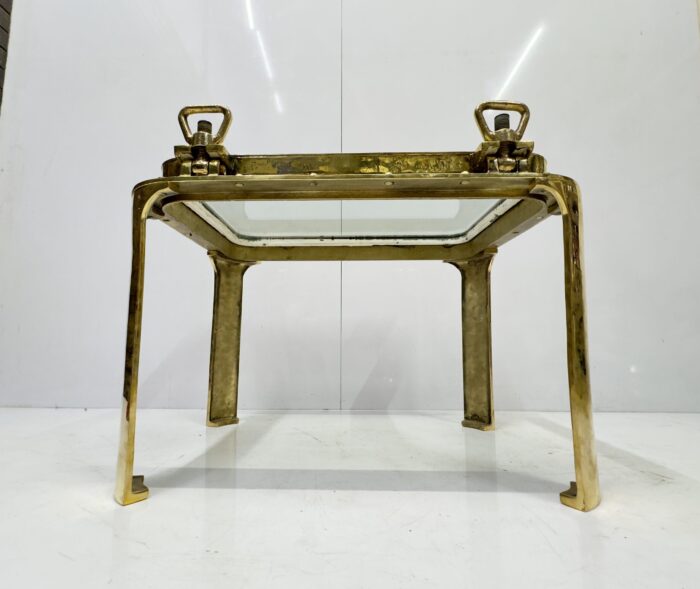 It is a Ship Salvaged Brass Square Porthole Hatch Window Nautical Style Coffee Table. It is salvaged from an Old supertanker Ships. It is a Square shape window used on ships to admit light and air. We have designed it as a Table. It will look great on your home to give a Vintage nautical look. It is made up of solid Brass metal and glass and it is easy to install. It is built to suit your home decoration. The metal is sturdy and strong. Decorate your home today with one of our Portholes Window products!