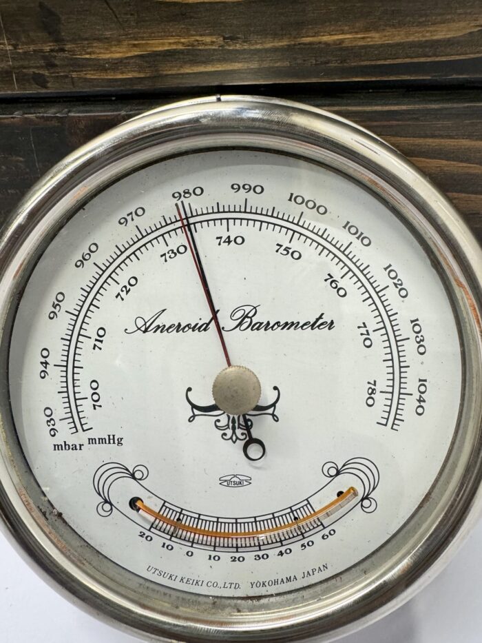 This exquisite vintage wall design round ship aneroid barometer, crafted by Utsuki Keiki in Yokohama, Japan, showcases a perfect blend of functionality and elegance. Its antique charm, making it an ideal decorative piece for maritime enthusiasts and collectors alike. The barometer not only serves as a reliable instrument for measuring atmospheric pressure but also adds a touch of historical sophistication to any interior space.